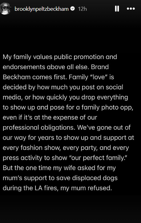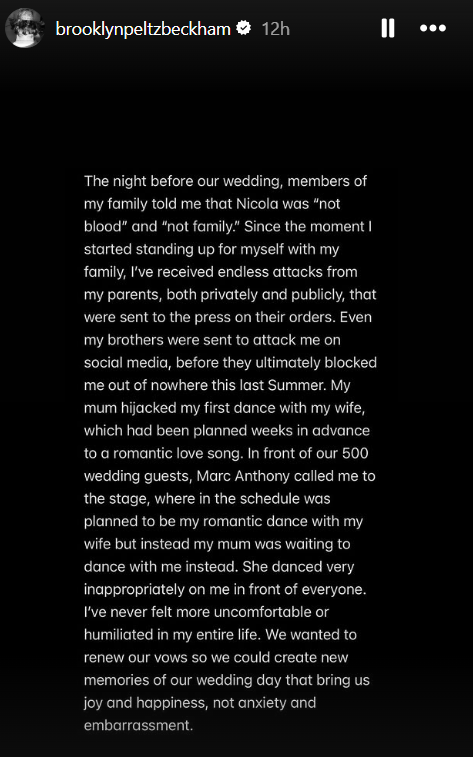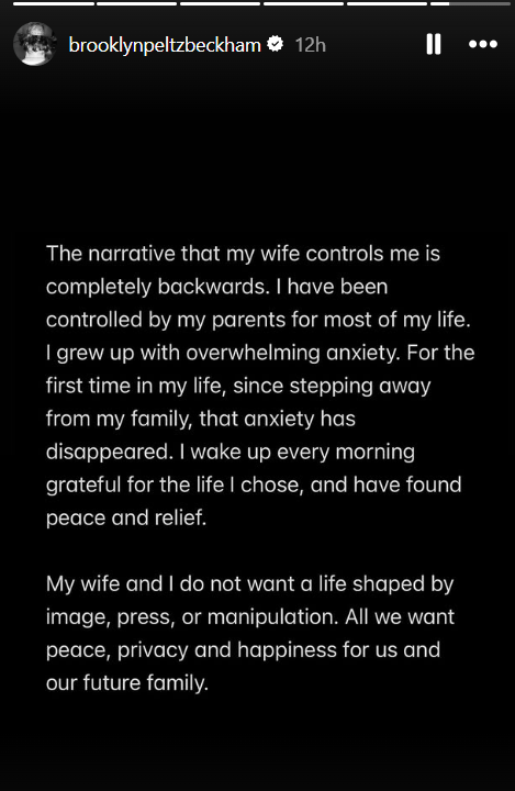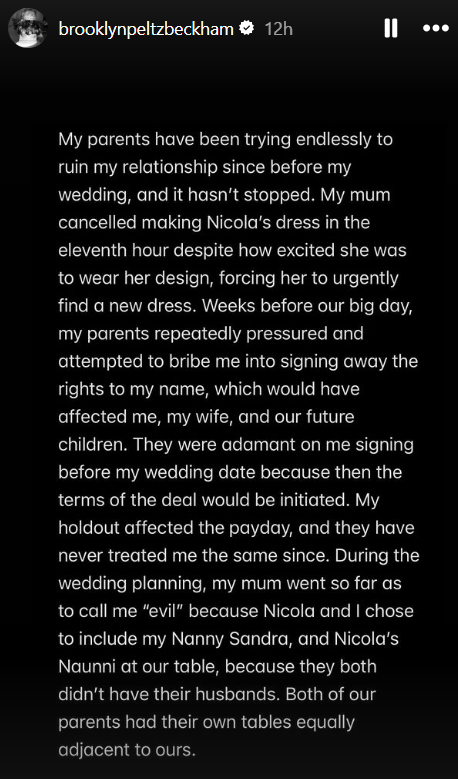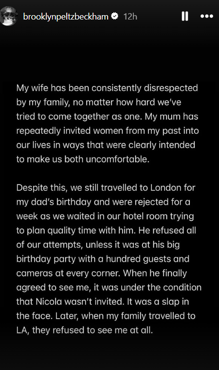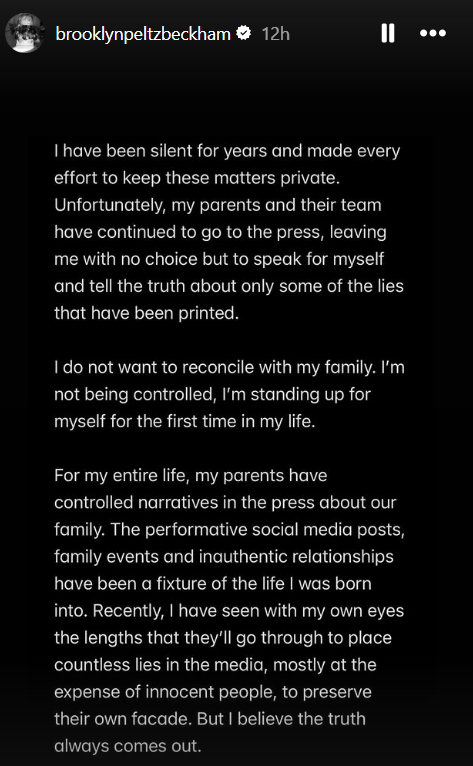 “I have been silent for years and have made every attempt to keep these matters private. Unfortunately, my parents and their team have continued to go to the press, leaving me with no choice but to speak for myself and tell the truth about only some of the lies that have been printed,” Brooklyn began his Instagram Stories post, which continued across multiple slides.